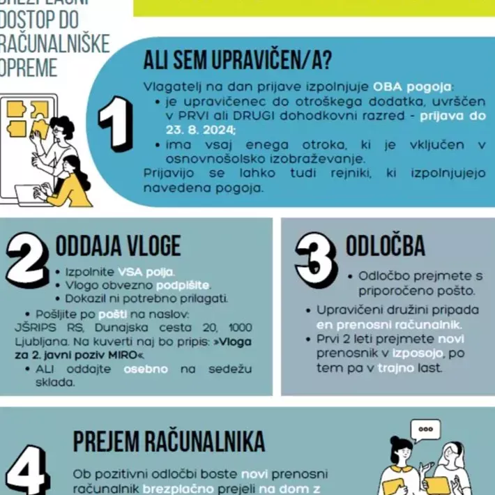 Vlagatelji, ki so oddali vlogo na 1. Javni poziv za dodelitev računalniške opreme v izposojo za leto 2024, in so prejeli negativno odločbo, ali še niso bili obveščeni o izidu postopka obravnave vloge, lahko ponovno vložijo vlogo na 2. Javni poziv za dodelitev računalniške opreme.