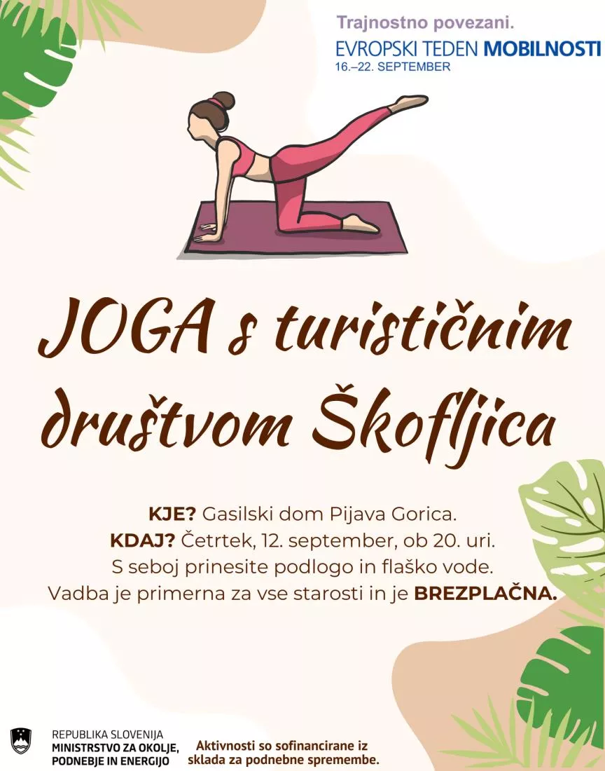 Vabimo vas, da se pridružite brezplačni jogi, ki bo potekala v gasilskem domu Pijava Gorica v četrtek, 12. septembra, ob 20. uri. Udeležba je primerna za vse starostne skupine in je odlična priložnost za sprostitev in druženje. Dogodek organizira Turistično društvo Škofljica v okviru Evropskega tedna mobilnosti. Pridružite se nam in skupaj naredimo korak k bolj zdravemu in aktivnemu življenjskemu slogu!