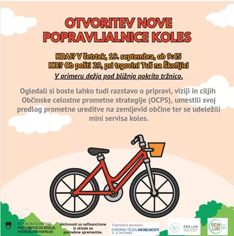 Pred trgovino Tuš na Škofljici, bo septembra zaživela nova popravljalnica koles! Otvorili jo bomo v četrtek, 19. septembra ob 9:45, s posebnim dogodkom, na katerem bodo strokovnjaki iz Regionalne razvojne agencije Ljubljanske urbane regije izvajali mini servis koles. V primeru dežja se bo mini servis koles prestavil pod bližnjo pokrito tržnico.
