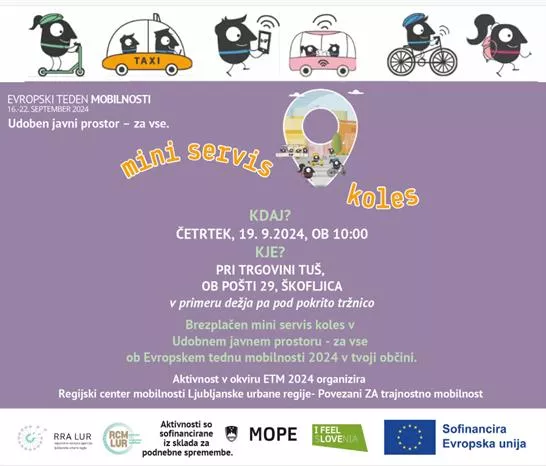 Pred trgovino Tuš na Škofljici, bo septembra zaživel kotiček za brezplačni mini servis koles! Otvorili ga bomo v četrtek, 19. 9.2024, ob 10h, s posebnim dogodkom, na katerem bodo strokovnjaki iz Regionalne razvojne agencije Ljubljanske urbane regije izvajali mini servis koles. V primeru dežja se bo mini servis koles prestavil pod bližnjo pokrito tržnico.